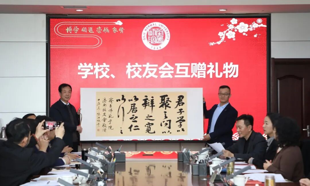在热烈的氛围中,林松柏、牟树勋共同为济南校友会揭牌,孙洪兆代表学校向济南校友会赠送纪念礼物,济南校友会会长赵延银代表校友会向学校赠送1992级校友张传旭教授书法作品。