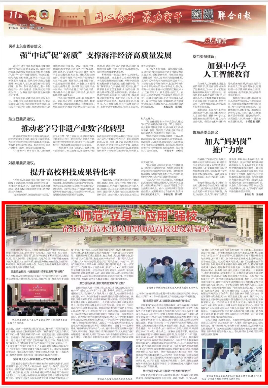 学校发展的优异成绩,以及委员们的建议、提案和发言受到了社会各界的广泛关注。会议期间,山东省政协机关报《联合日报》两会特刊以《“师范”立身 “应用”强校 奋力谱写高水平应用型师范高校建设新篇章》为题,以半版的版面对我校党建引领高质量发展成果经验进行专题报道,对我校各项突破性发展成果进行了详细介绍。我校省政协委员结合自身工作岗位、学科专业优势,聚焦山东省经济社会发展的重点、核心问题,积极参政议政,认真履行职责,受到了山东教育新闻视频号、济南日报新黄河客户端、山东民进公众号采访报道。